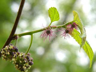 たく(たへ)はコウゾ(クワ科の植物)で、ヒメコウゾとカジノキの雑種とされています。ヒメコウゾの別名をコウゾとする場合もあり、コウゾには楮の字を用い、カジノキには梶、構、榖の字をあてていますが、現物を見て識別するのはなかな か難しいものです。 現代でも植物の名前は地方により違うことがあり、混同、あるいは混乱が多いようで、追っかけをしている私も頭を悩ますところ。 おおざっぱに、葉に切れ込みがあるのは楮、切れ込みが無いのは構(梶、カジノキ)」と考えることにします。 種別としては両者「楮」にまとめられていますから。 コウゾの果実は桑の実に似た集合果。夏に赤朱色に熟し甘みがあって食すこともできますが、舌触りが悪く積極的に食べたいものではありません。 『万葉集』では、たく(コウゾ)の皮から取っった長い繊維を「栲(たく)」と、言い表し、それを編んだものが「栲縄(たくなは)」で、「長い」を引き出す 枕詞として使われています。栲(たく)は楮の古名とされ、その繊維が丈夫なので、古くから衣類、網、縄、衾(ふすま)、領布(ひれ)などに用いられてきました。 「たく」で織られたものが「たへ」、特に美しいものは「しろたへ」と詠われています。 さらに、楮の皮の繊維を蒸して水にさらし、細かく割いて作った糸を木綿(ゆう)と言 い、神道の祭事に用いられる白い襷(たすき)や幣(ぬさ)に利用されます。現代の紙で作った紙垂(しで)に通じるものがありますね。 (「ゆふ」参照)この木綿(ゆふ)はいわゆる木綿(もめん・ワタ )とは別のもの。 「紙麻(かみそ) → 「かみぞ」 → 「こうぞ」と音便化に変化したとも言われ、古い時代から和紙の材料として貴重なものでした。コウゾの皮の繊維は麻の次に長くて、繊維が互いに絡み合い粘りの強い紙が出来上がります。 別名「紙の木」「山麻」、「黒麻」。 『日本書紀』には、610年朝鮮の僧が製紙技術を日本に伝えたとあり、コウゾも同時に渡来したと考えられます。 |